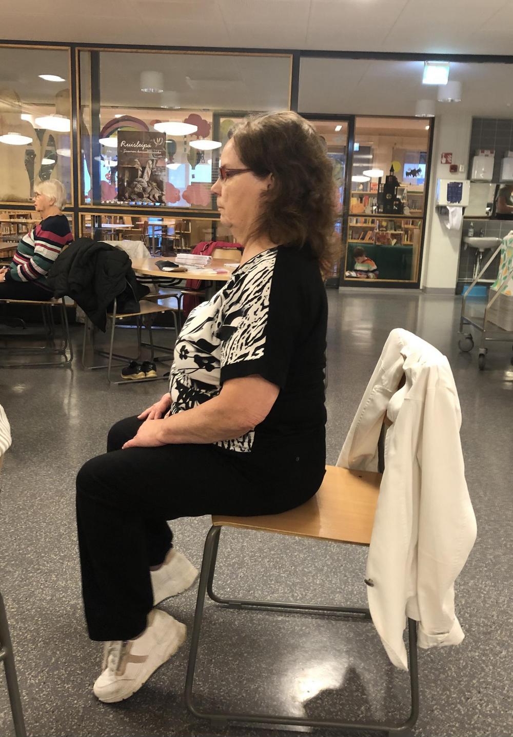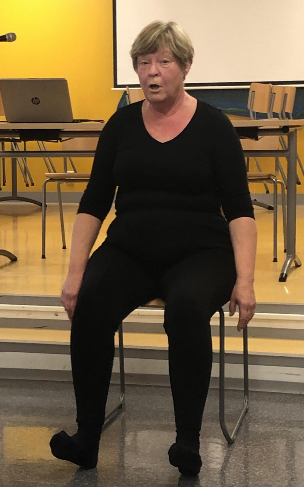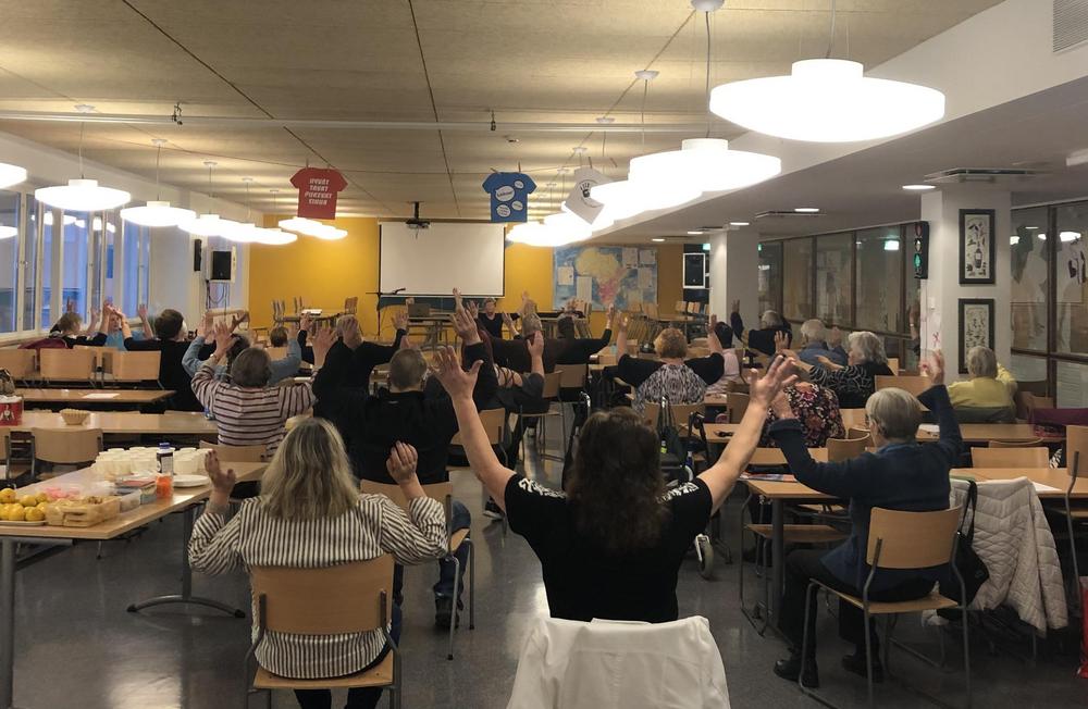 Maaiskuun tiistaitapaamisessa aloitimme tuolijumpan,, jota ohjaa Eija Inki. Jumppaa mukana tiistaitapaamisessamme kerran kuukaudessa. Kuvassa osa jumppaan osallistuneita aktiiveja.