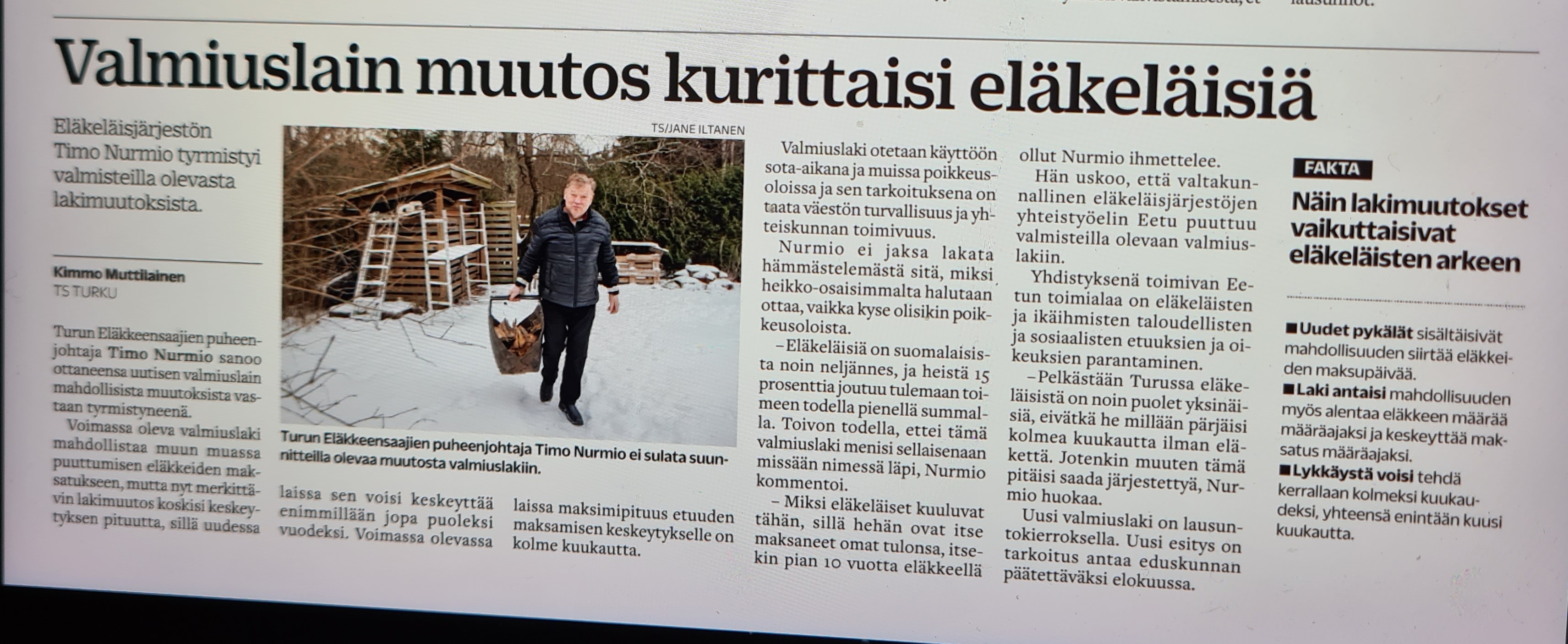 Eläkeläisjärjestön Timo Nurmio tyrmistyi valmisteilla olevasta lakimuutoksesta. Turun Sanomissa tänään julkaistu uutinen löytyy alla olevan linkin takaa.